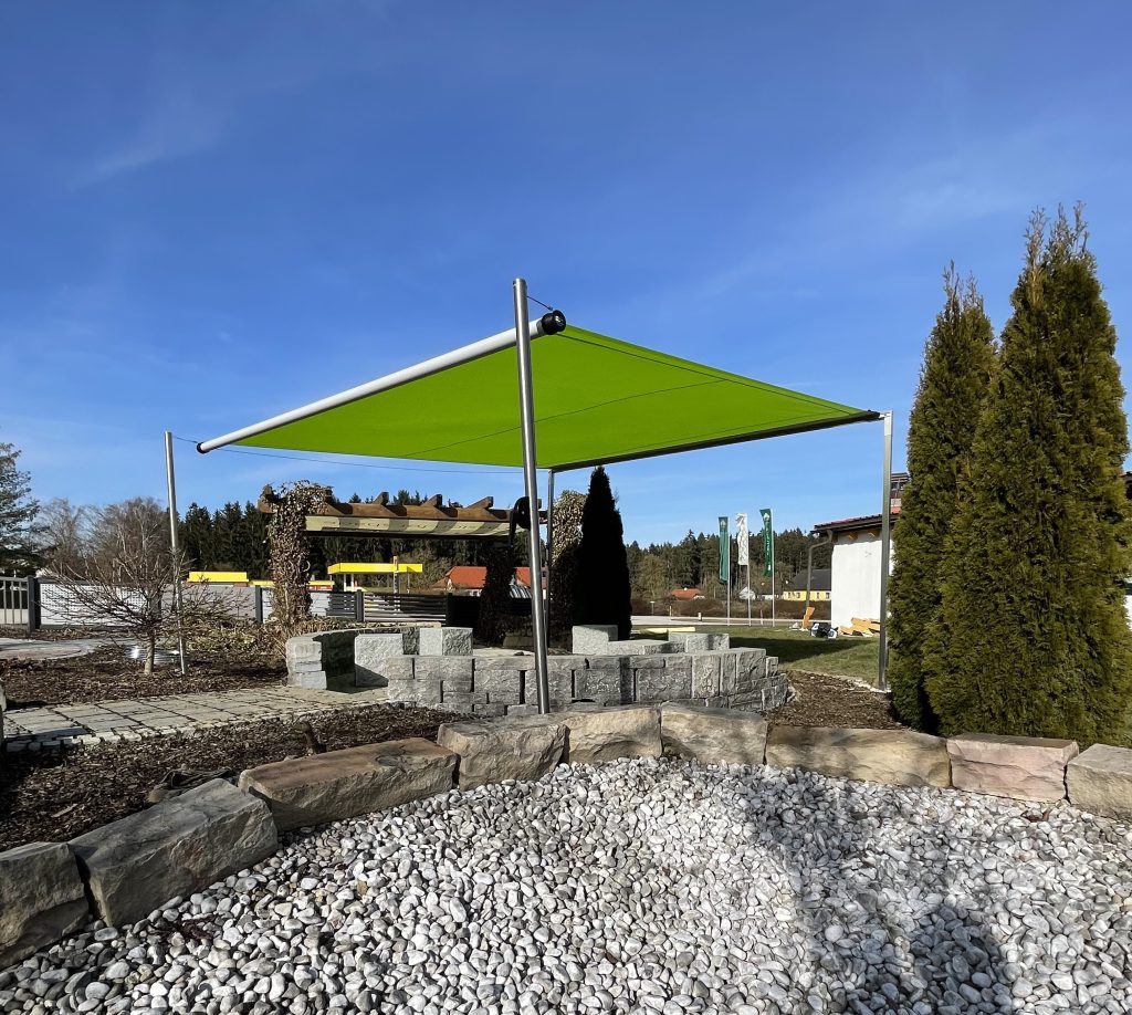 Das SHADE Tuch besteht aus hochfestem Polyester mit beidseitiger PU-Beschichtung. Das niedrige Flächengewicht des Tuches harmoniert perfekt mit der Funktionsweise des Systems. Das speziell entwickelte Gewebe überzeugt durch seine sehr gute UV- und Wasserdruckbeständigkeit. Alle verwendeten Stoffe haben einen UPF-Wert von 50+